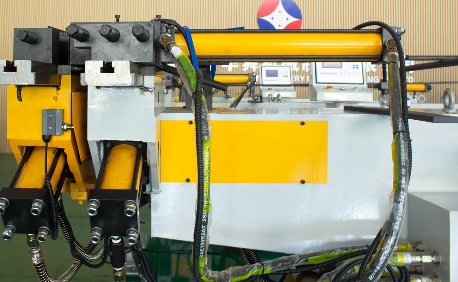 The Human Interface provides easy switching between auto and manual modes. The machine features a standard clockwise bending direction and fully hydraulic clamping on both the clamp die and pressure die for secure material handling. The hydraulic system is arranged in a level-way configuration for stability.